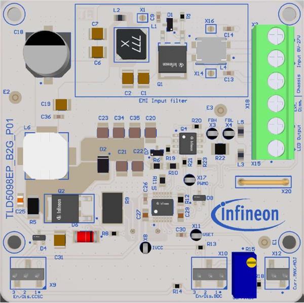 Infineon TLD5098EPB2GEVALKITTOBO1 Switching Controller evaluation board in boost to ground topology designed as LED driver | EMIN.COM.MM