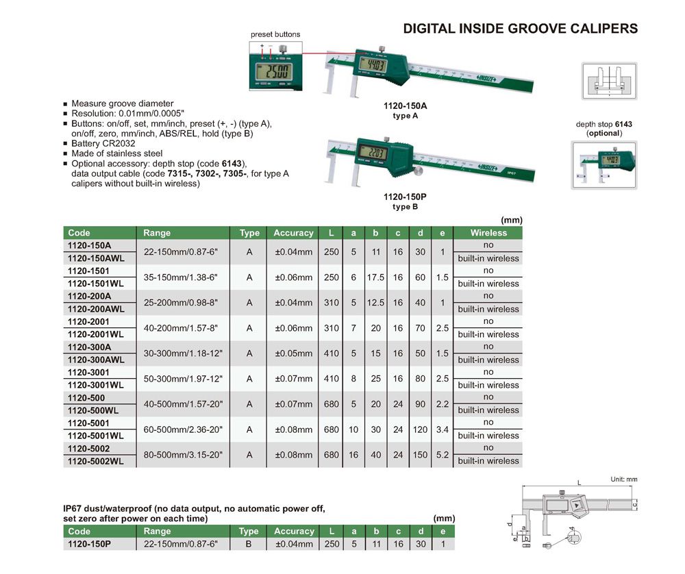 INSIZE 1120-150P Digital Inside Groove Caliper (22-150mm/0.87-6"; ±0.04mm; 0.01mm/0.0005")