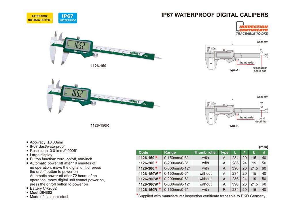 INSIZE 1126-150R IP67 Waterproof Digital Caliper (0~150mm/0~6"; 0.01mm/0.0005") | EMIN.COM.MM