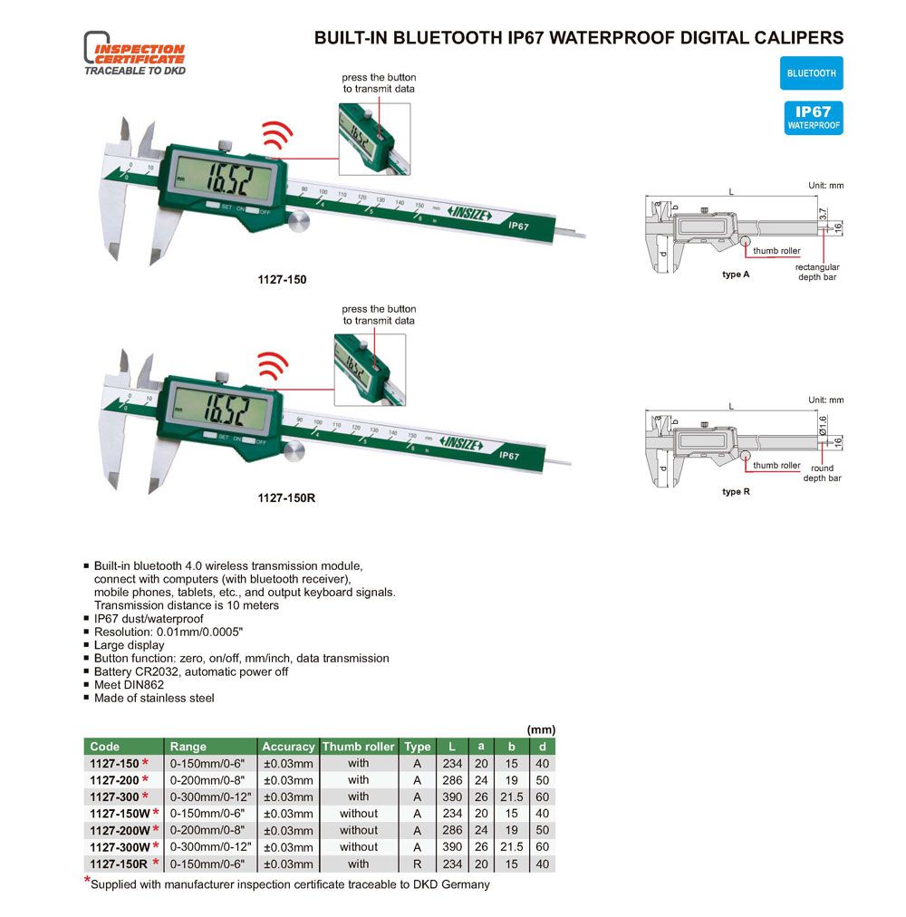 INSIZE 1127-150R Built-in Bluetooth IP67 Waterproof Digital Caliper (0-150mm/0-6", ±0.03mm, 0.01mm/0.0005", with thumb roller)