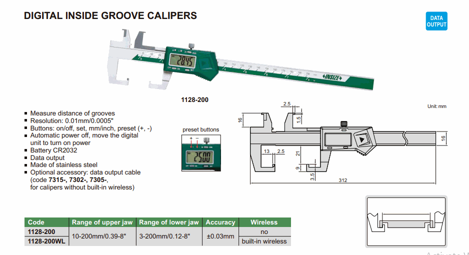 INSIZE 1128-200 Digital Inside Groove Caliper (10-200mm/0.39-8”; 3-200mm/0.12-8”; No built-in wireless)