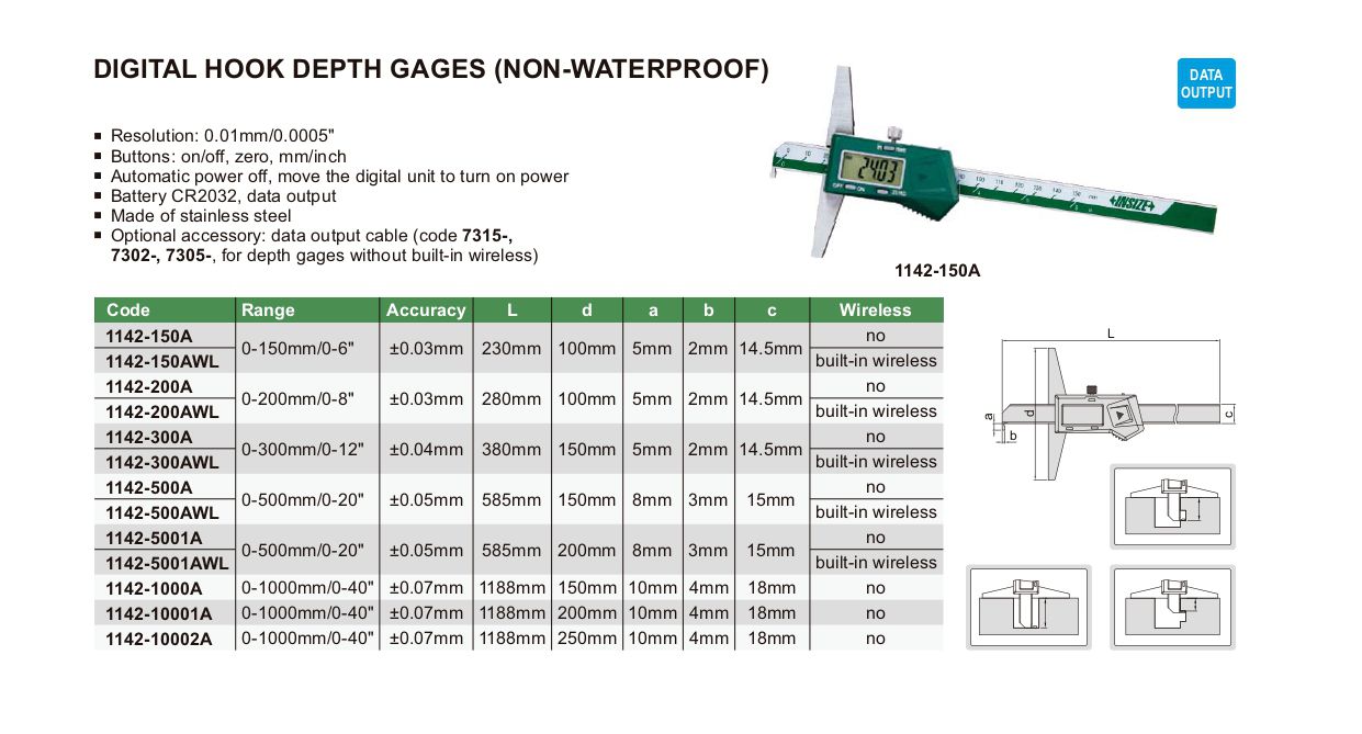 INSIZE 1142-500AWL Digital Hook Depth Gage (0-500mm/0-20") | EMIN.COM.MM