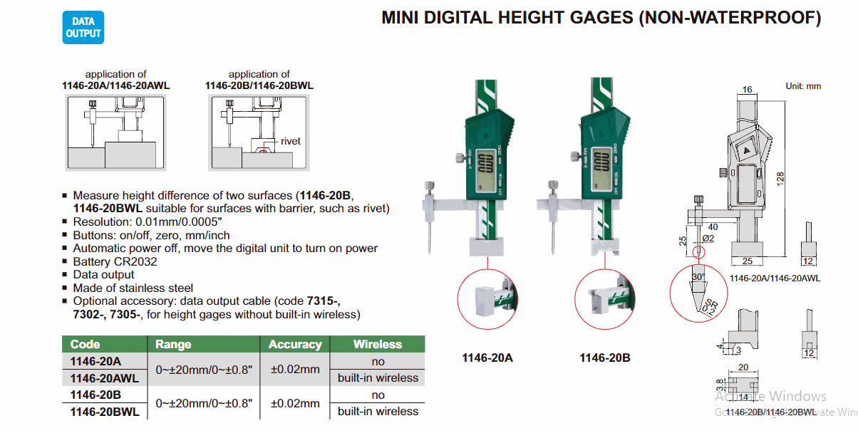 INSIZE 1146-20AWL Mini Digital Height Gage (0~±20mm; Built-in wireless) | EMIN.COM.MM