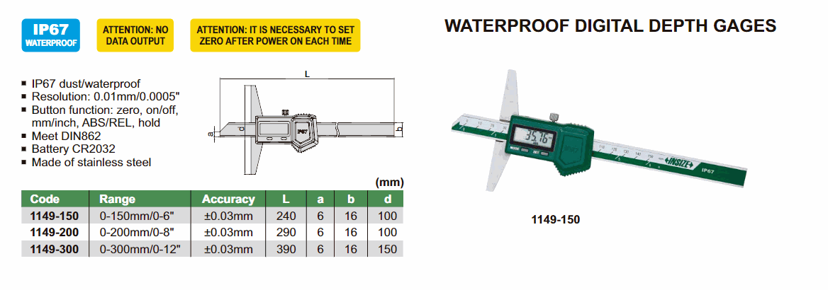 INSIZE 1149-300 Waterproof Digital Depth Gage (0~300mm) | EMIN.COM.MM