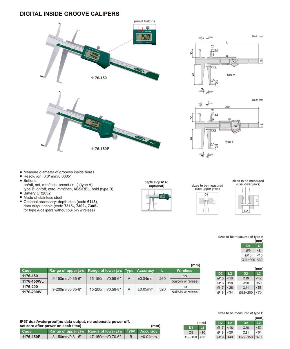 INSIZE 1176-200 Digital Inside Groove Caliper (9-200mm/0.35-8"; 15-200mm/0.59-8"; without built-in wireless)