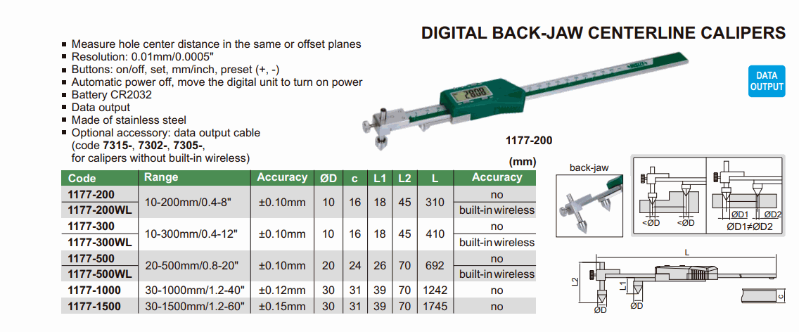 INSIZE 1177-500WL Digital Back-Jaw Centerline Caliper (20-500mm/0.8-20"; 0.01mm/0.0005") | EMIN.COM.MM