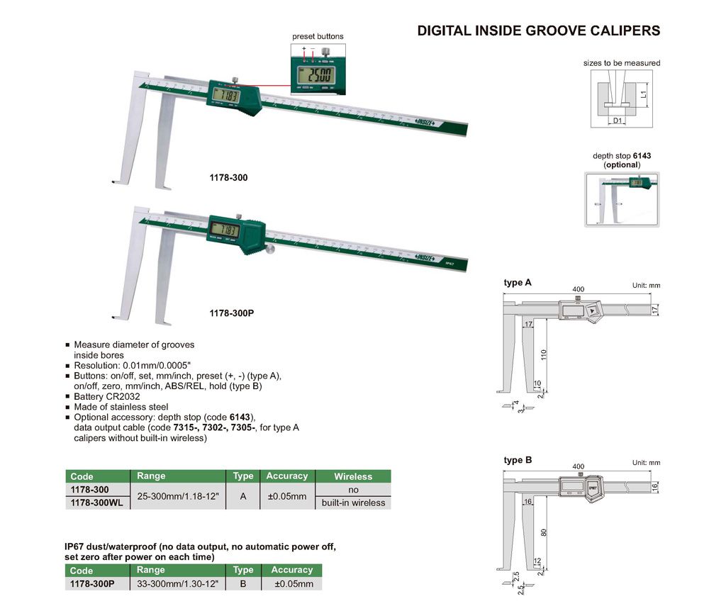 INSIZE 1178-300P Digital Inside Groove Caliper (33-300mm/1.30-12"; ±0.05mm; 0.01mm/0.0005")