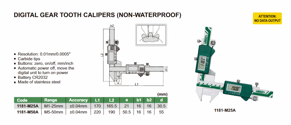 INSIZE 1181-M50A Digital Gear Tooth Caliper (M5-50mm, non-waterproof)