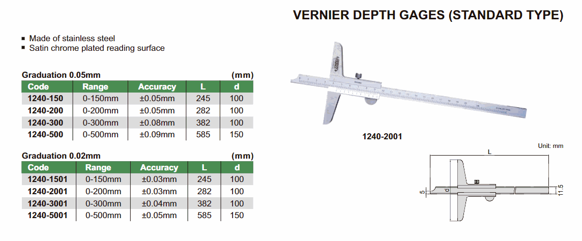 INSIZE 1240-200 Vernier Depth Gage (0~200mm; 0.05mm) | EMIN.COM.MM