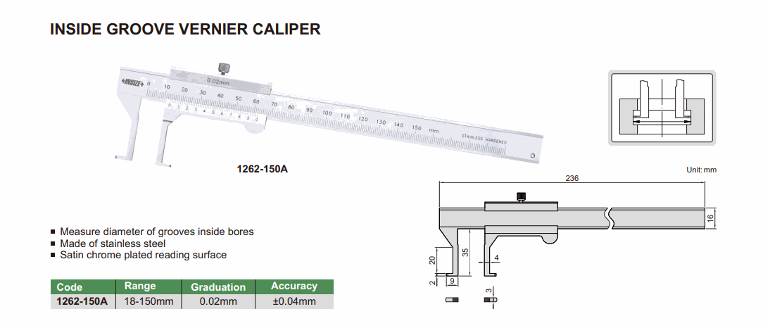 INSIZE 1262-150A Inside Groove Vernier Caliper (18-150mm; 0.02mm)