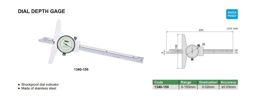 INSIZE 1340-150 Dial Depth Gage (0-150mm, ±0.03mm, 0.02mm)