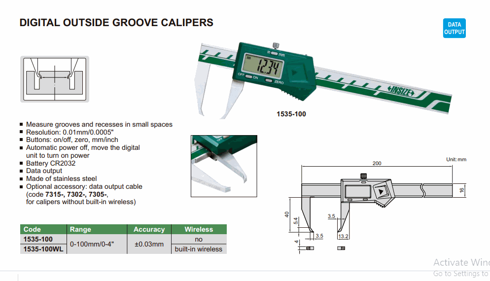 INSIZE 1535-100 Digital Outside Groove Caliper (0-100mm/0-4”; 0.01mm/0.0005”; no built-in wireless)