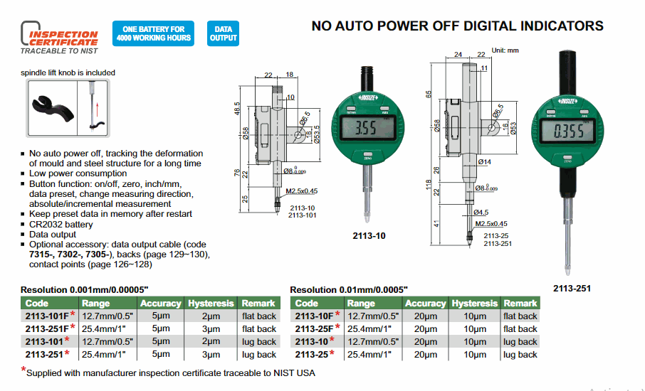 INSIZE 2113-10F No Auto Power Off Digital Indicator (12.7mm/0.5"; 0.01mm/0.0005") | EMIN.COM.MM
