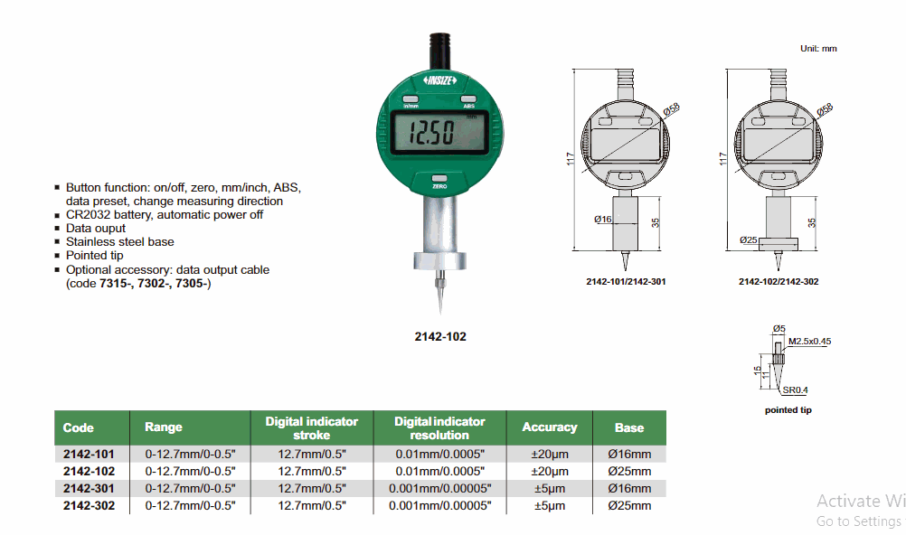 INSIZE 2142-302 Digital Depth Gage (0~12.7mm/0~0.5"; Ø25mm) | EMIN.COM.MM
