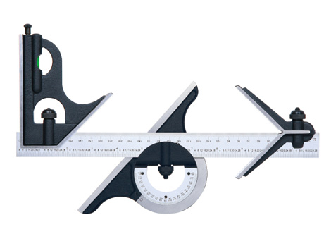 Protractor head (made of cast iron): set the blade at desired angle to an edge of a workpiece, and can be used to measure angles