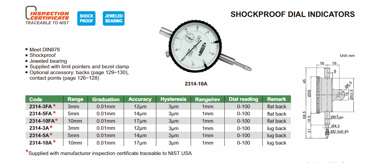 INSIZE 2314-10FA Shockproof Dial Indicator (10mm)