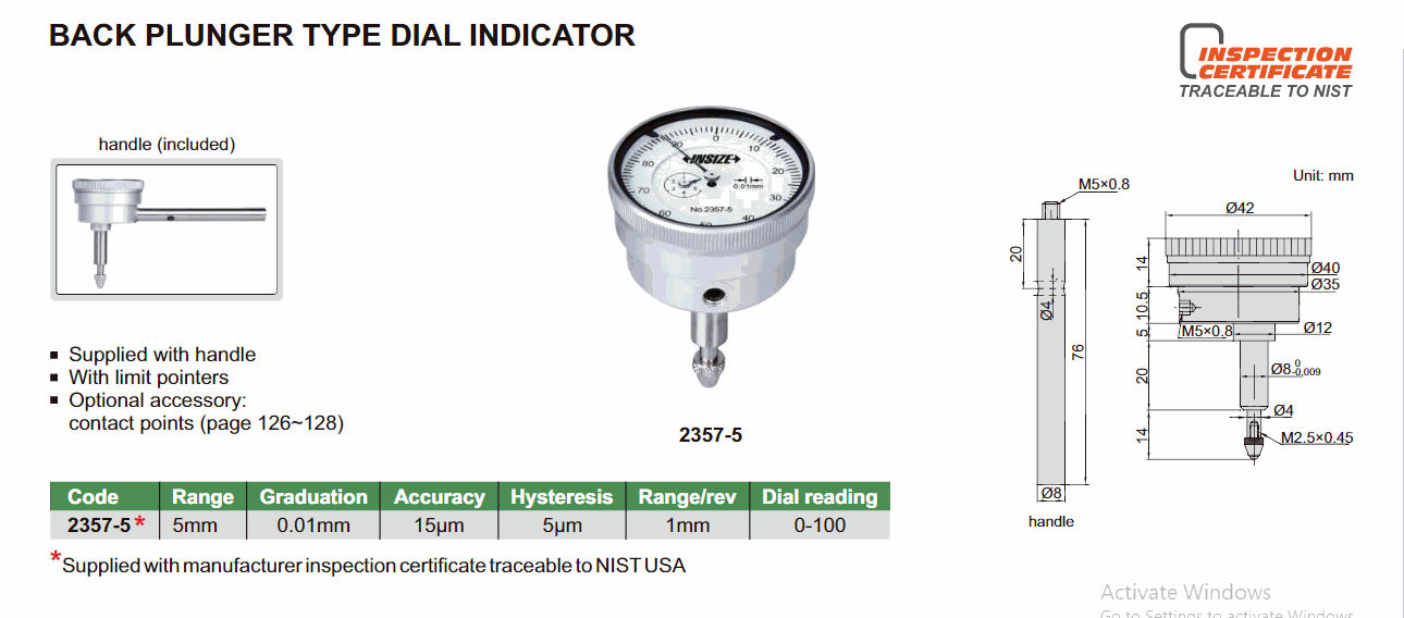 INSIZE 2357-5 Back Plunger Type Dial Indicator (5mm; 0.01mm) | EMIN.COM.MM