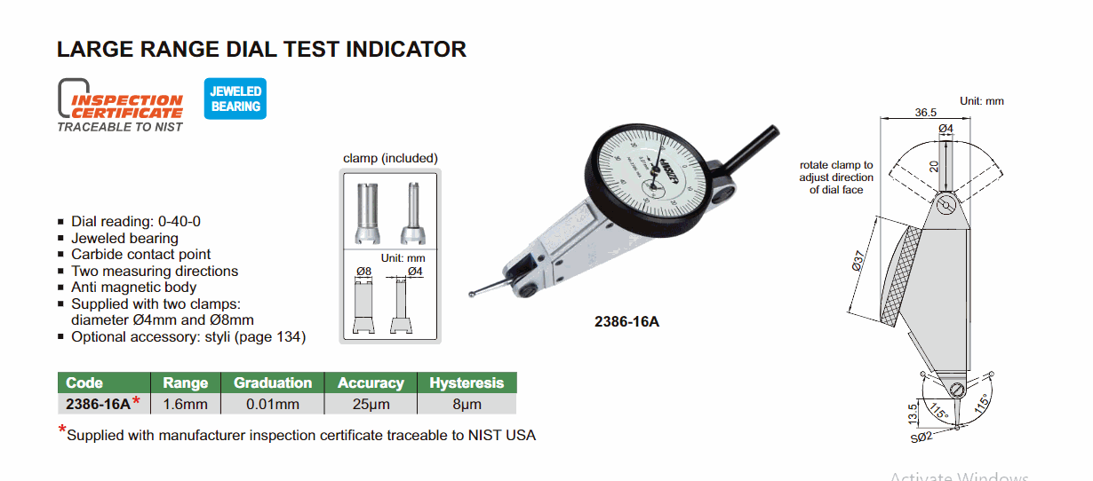 INSIZE 2386-16A Large Range Dial Test Indicator (1.6mm; 0.01mm)