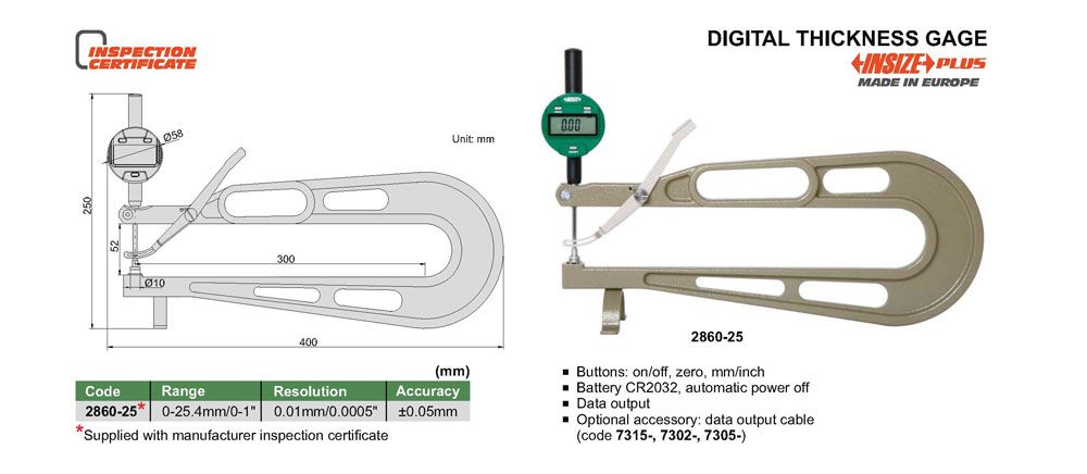 INSIZE 2860-25 Digital Thickness Gage (0-25.4mm/0-1", ±0.05mm, 0.01mm/0.0005")