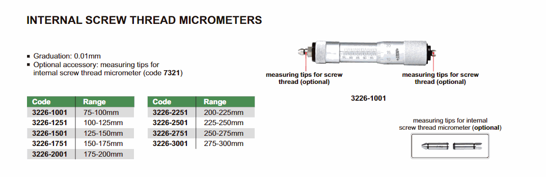 - Measuring tips for internal screw thread micrometer (code 7321)