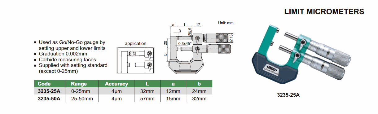 INSIZE 3235-25A Limit Micrometer (0-25mm; Accuracy: 4µm)