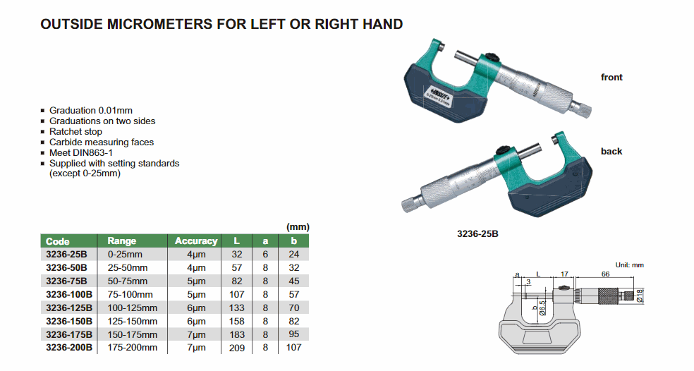 INSIZE 3236-50B Outside Micrometer For Left And Right Hand (25-50mm; 0.01mm; 4µm) | EMIN.COM.MM