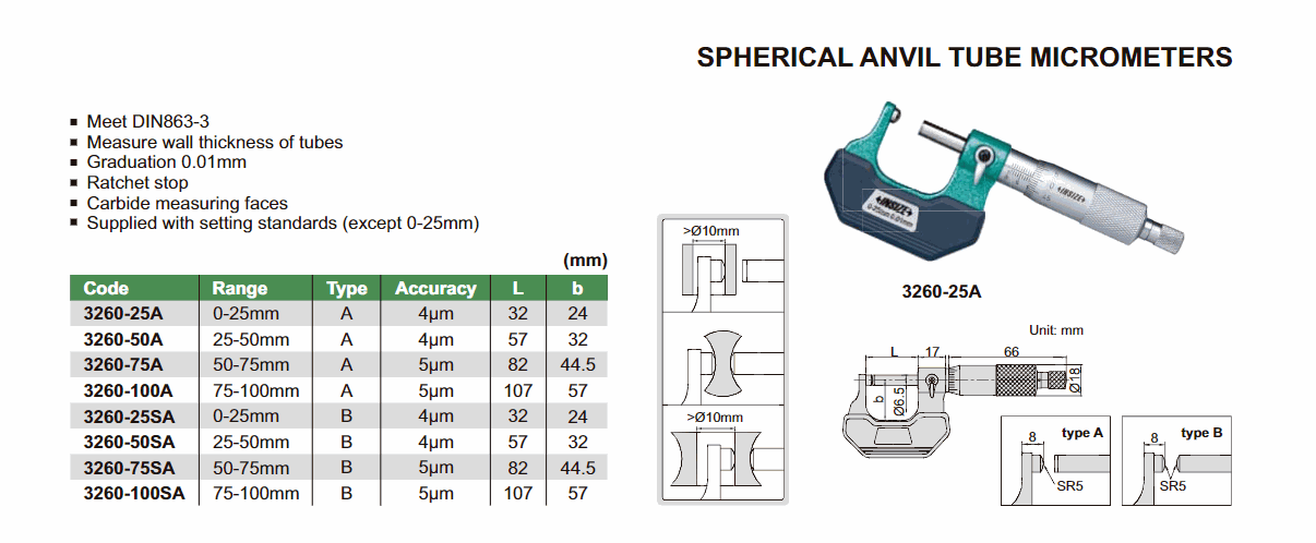 INSIZE 3260-25A Spherical Anvil Tube Micrometer (0-25mm; 0.01mm; type A)