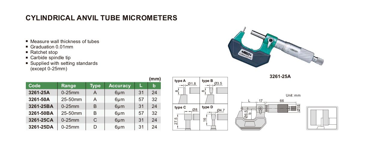 INSIZE 3261-25A Cylindrical Anvil Tube Micrometer (0-25mm)