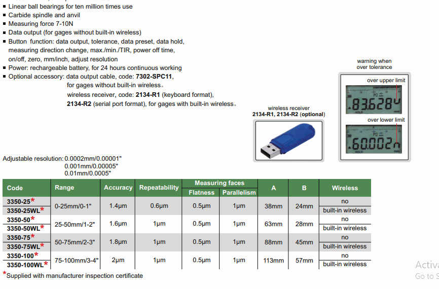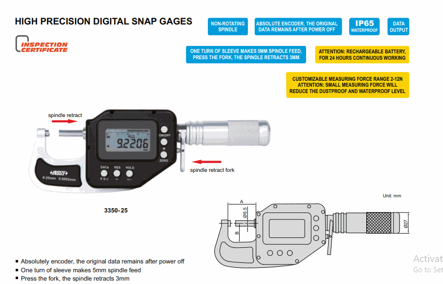 Button function: data output, tolerance, data preset, data hold, measuring direction change, max./min./TIR, power off time, on/off, zero, mm/inch, adjust resolution
