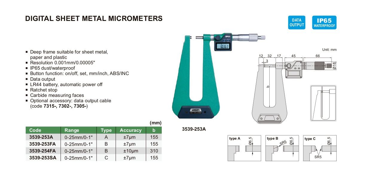 INSIZE 3539-254FA Digital Sheet Metal Micrometer (0-25mm/0-1") | EMIN.COM.MM