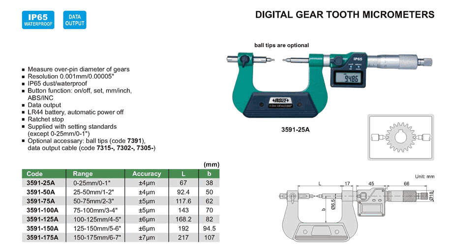 INSIZE 3591-75A Digital Gear Tooth Micrometer (50-75mm/2-3") | EMIN.COM.MM