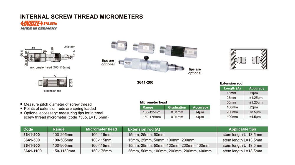 INSIZE 3641-500 Internal Screw Thread Micrometer (100-505mm)