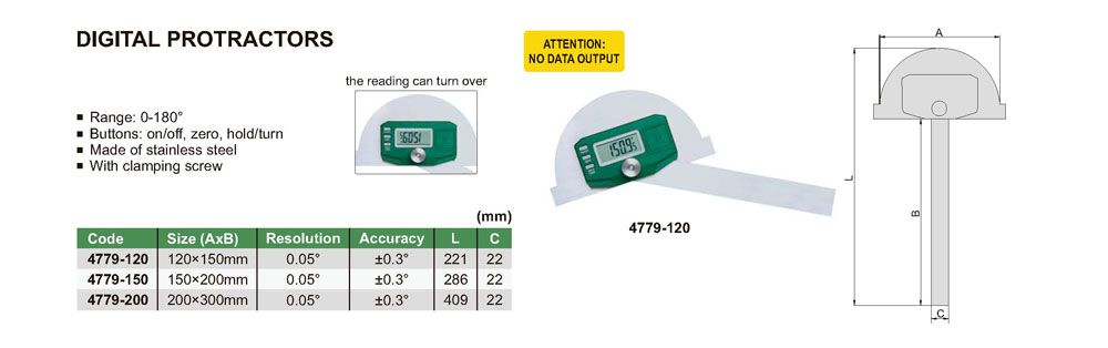 INSIZE 4779-150 Digital Protractor (0-180°, 0.05°, 150x200mm)