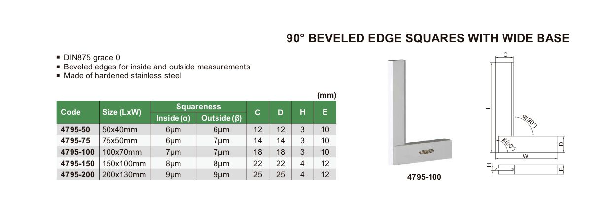 INSIZE 4795-100 90° Beveled Edge Square With Wide Base (100x70mm)