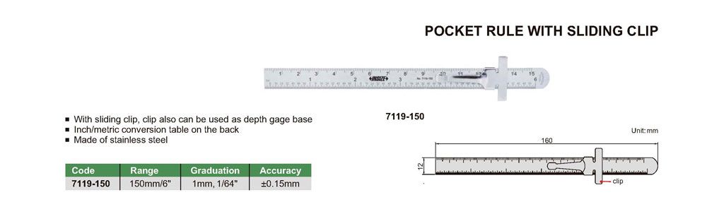 INSIZE 7119-150 Pocket Rule With Sliding Clip (150mm/6”; 1mm; 1/64”)