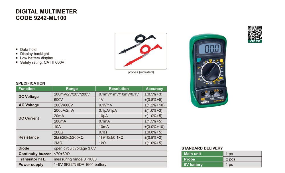 -Range: 200mV/2V/20V/200V/600V