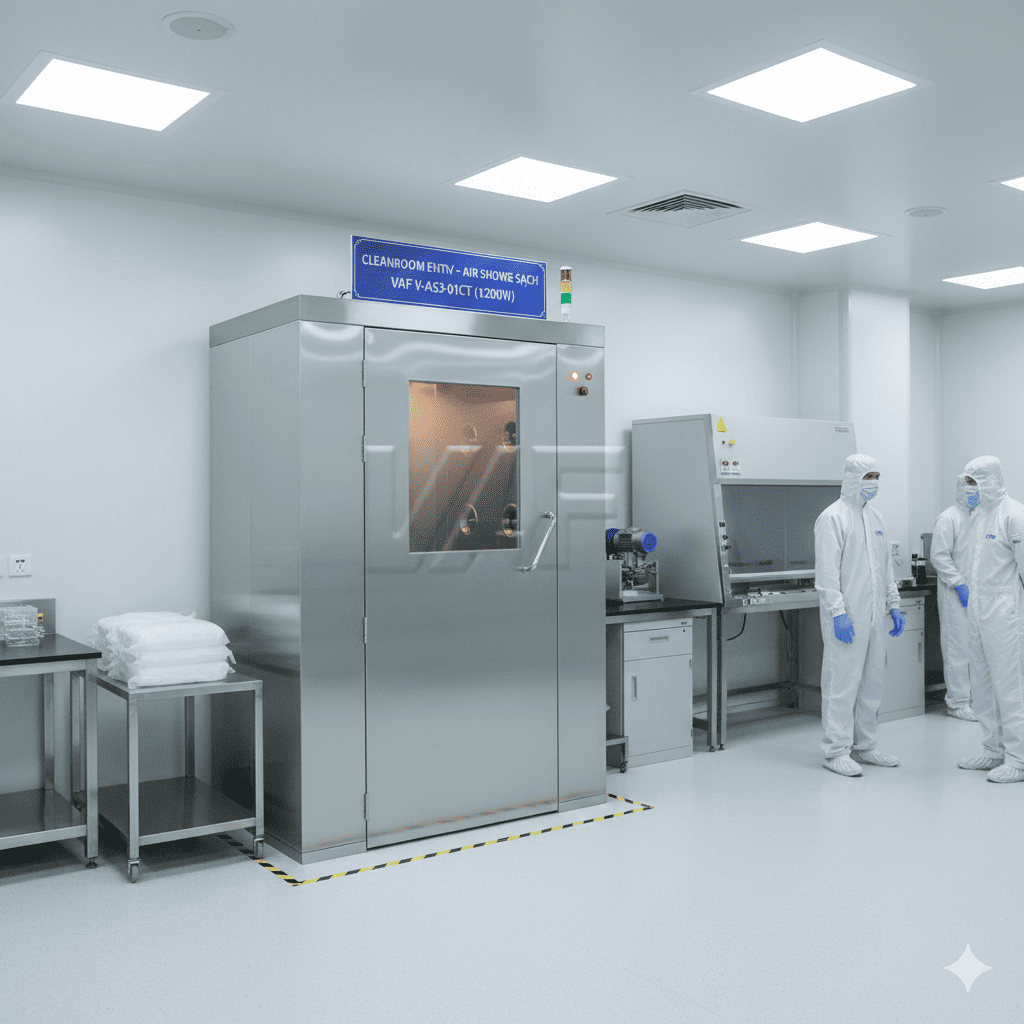 The air chamber is an intermediate device located at the entrance of the clean room, with the task of removing dust, microorganisms and impurities on clothes, shoes, trolleys or materials before entering the production area. Thanks to the high-speed clean air flow combined with HEPA filter, the air in the chamber is continuously cleaned and blown directly onto the surface to be cleaned at a speed of about 20-25 m/s.