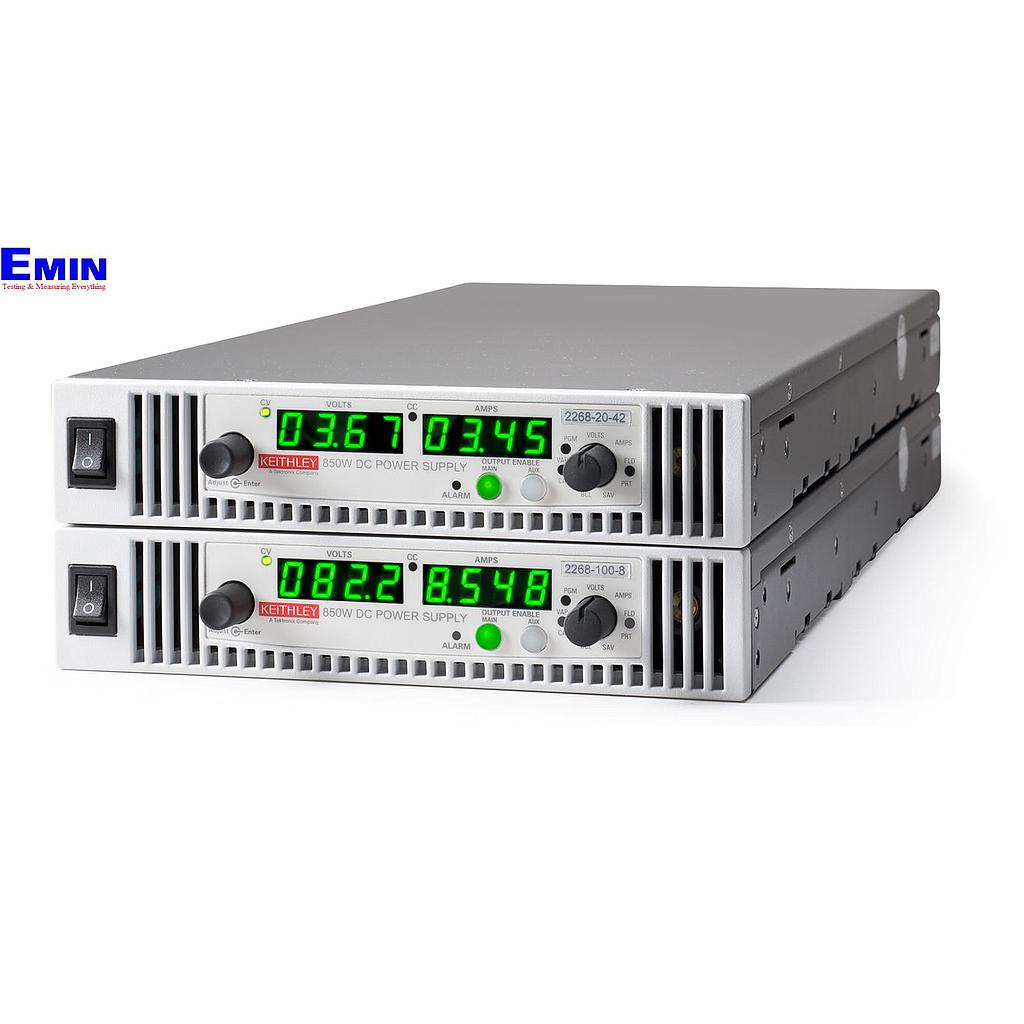 The six models in the 850W DC power supplies in the Series 2268 provide voltage and current output levels well suited for automated test applications. They offer maximum voltage outputs of 20V, 40V, 60V, 80V, 100V, and 150V with corresponding maximum current outputs of 42A, 21A, 14A, 10.5A, 8.5A, and 5.6A. Series 2268 power supplies allow outputting any current, including the maximum current, at any voltage. They provide both analog and digital control options and a number of digital interface options and can operate in constant voltage (CV), constant current (CC), or constant power modes to address a broad array of applications. These high-efficiency, soft-starting power supplies provide reliable performance and long life.