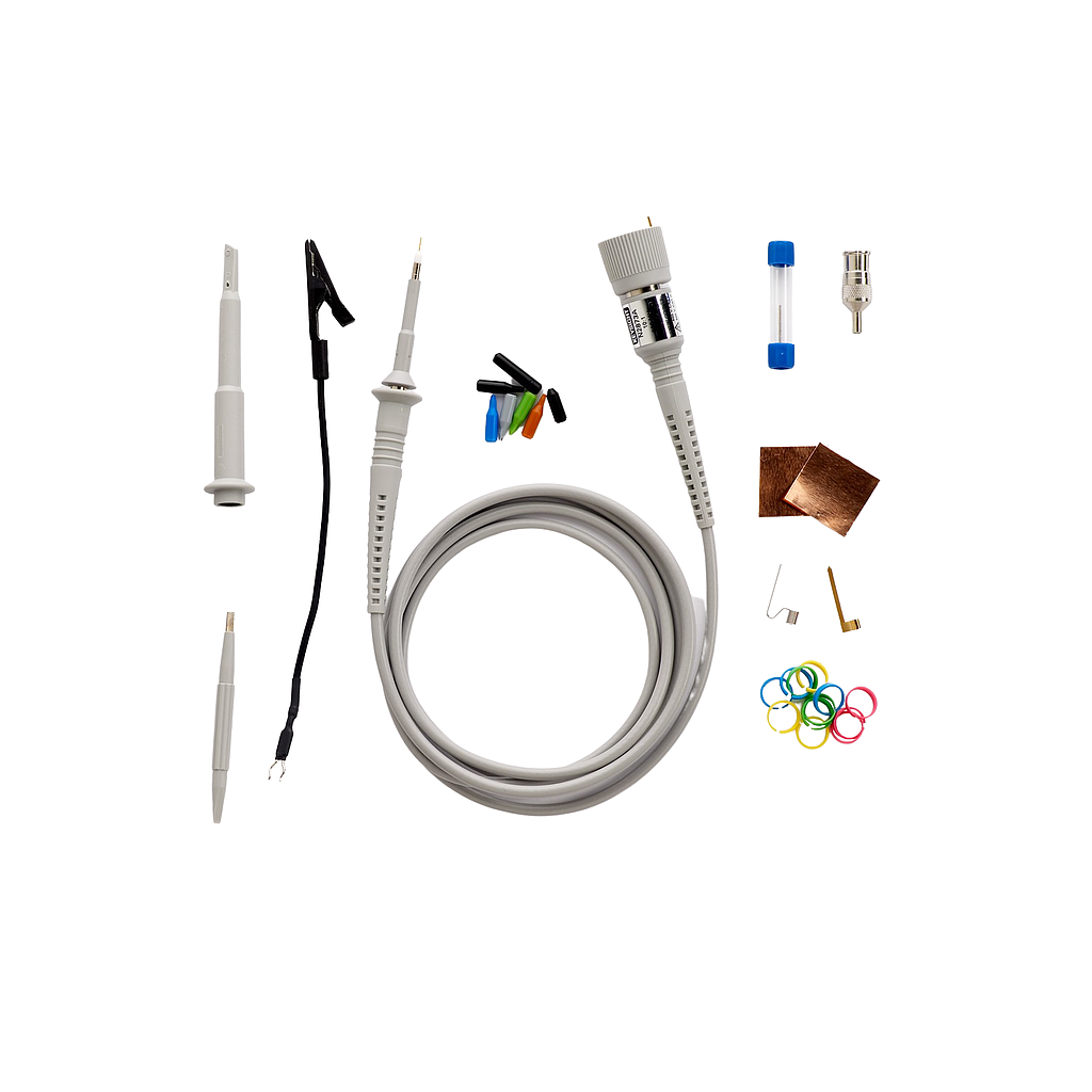 The sharp probe tip is spring loaded to help engineers keep the probe from slipping off the device under test. Insulating IC caps keep the small probe tip centered on the IC lead and keep it from shorting adjacent leads. Standard flat blade ground connector and self-adhesive copper ground pad help reduce ground inductance while offering easy ground access. Optional probe tip accessories provide specialized capabilities for demanding applications.