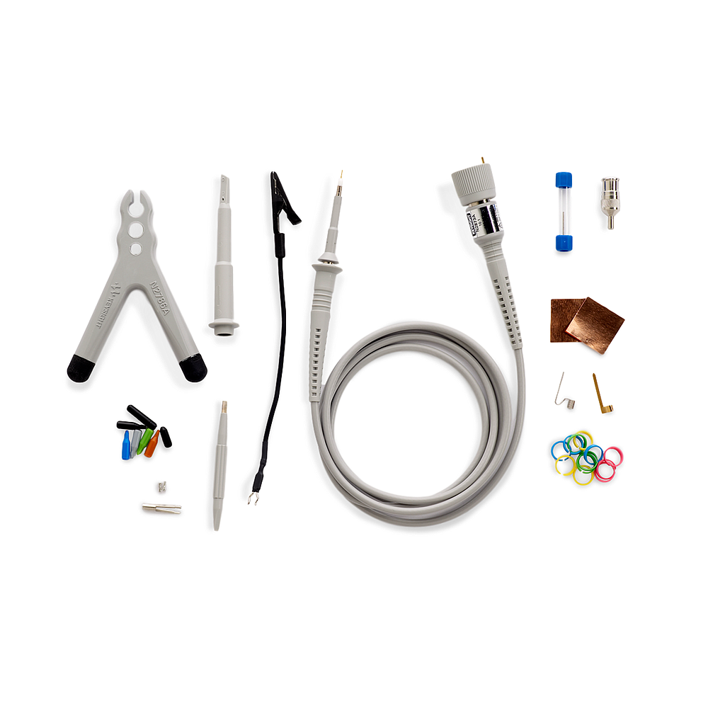 The sharp probe tip is spring-loaded to help engineers keep the probe from slipping off the device under test. Insulated integrated circuit (IC) caps keep the small probe tip centered on the IC lead and keep it from shorting adjacent leads. A standard flat-blade ground connector and self-adhesive copper ground pad help reduce ground inductance while offering easy ground access. Optional probe tip accessories provide specialized capabilities for demanding applications.