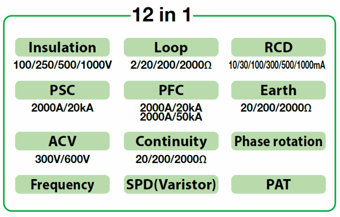Insulation: Resistance test 100, 250, 500 & 1000V with auto discharge voltage.