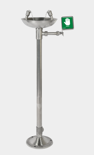 Application: Eye/face wash for pedestal mounting. Two spray heads deliver a flood of water over a wide area of coverage for complete rinsing of eyes and face.