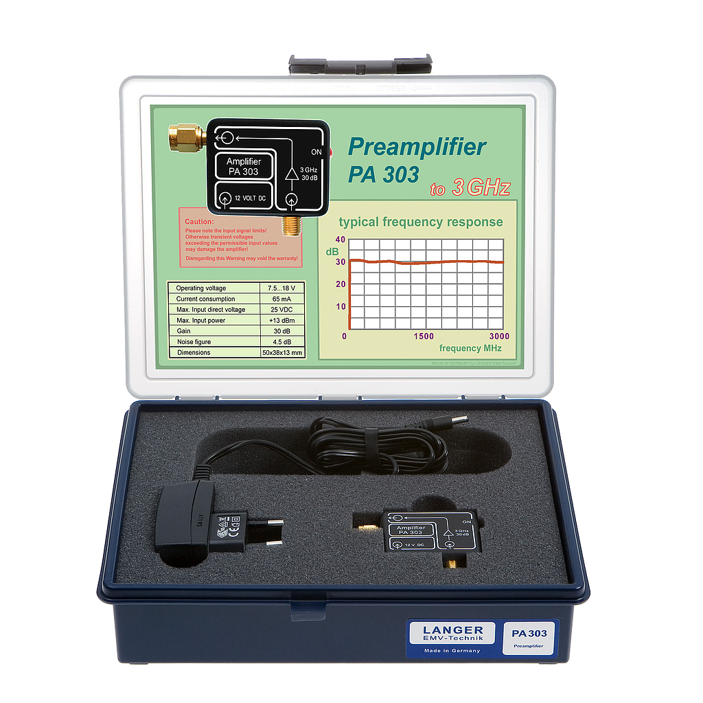 The PA 303 SMA preamplifier is designed for the amplification of measuring signals, e.g. weak signals of near-field probes with high resolution. The PA 303 is connected to the 50 ohm input of a spectrum analyzer or an oscilloscope and is powered by the wall-plug transformer. With the correct cable a near-field probe can be connected to the input of the preamplifier. The input and the output of PA 303 SMA use SMA connectors.