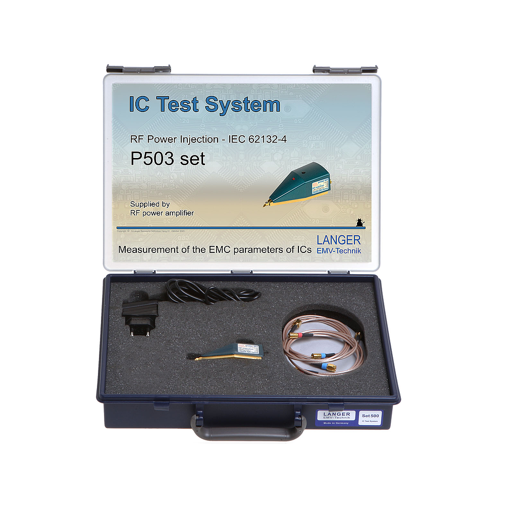 The P503 probe set is used for conducted measurements of immunity according to IEC 62132-4. The gained knowledge of immunity parameters allows the IC optimization as well as the definition of the application requirements.