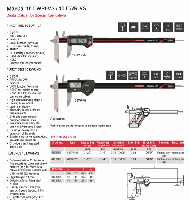 Mahr 4103383 Digital Caliper for Special Applications (16 EWRi-VS, 0-200mm)
