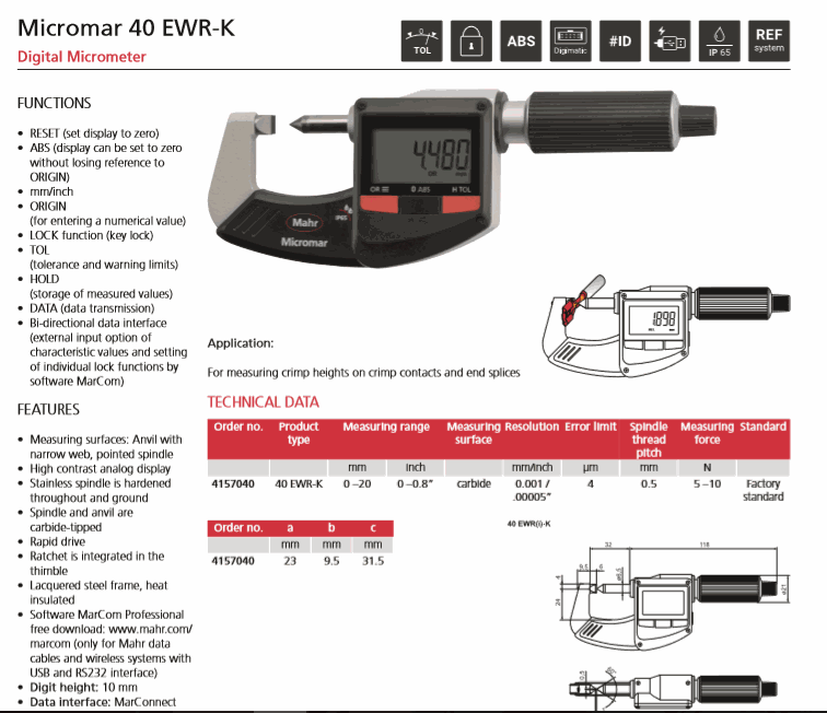 Mahr 4157040 Digital Micrometer (40 EWR-K, 0-20mm/0-0.8") | EMIN.COM.MM