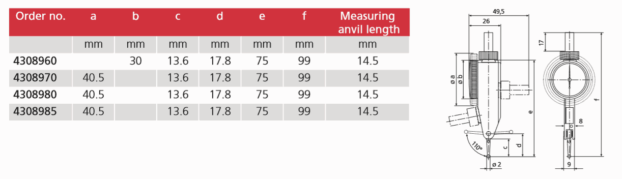 Package contains: case, instruction manual, spanner for changing the styli, stylus dia. ø 2 mm, mounting shaft 800a3/8