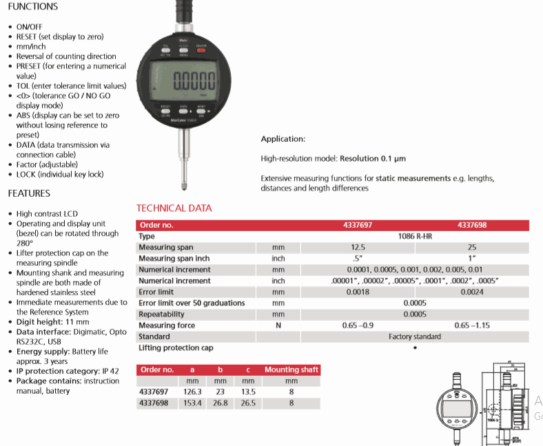 Resolution: 0.0005, 0.001, 0.002, 0.005, 0.01mm/.00002”, .00005”, .0001”, .0002”, .0005”