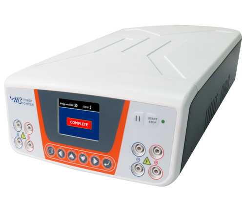 Major Science offers 3 models of power supplies constructed with microprocessor controller and 4 pairs of outlet terminals which covers the broadest range of application in general laboratory. The microprocessor control can perform either continuous or timed output, and user is able to pause and resume anytime without resetting the timer.