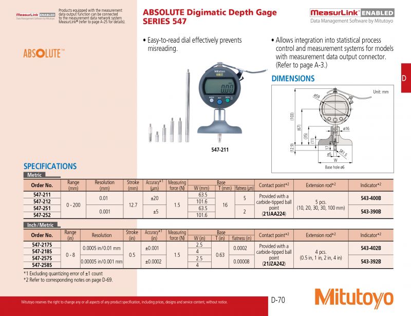 MITUTOYO 547-252 Digital Depth Gages (0-200mm/0.001mm) | EMIN.COM.MM